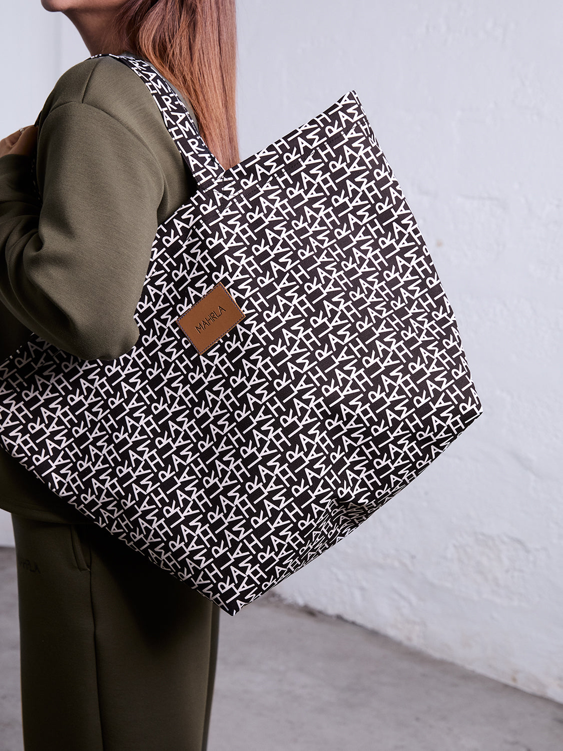 Saco estilo shopper com tecido estruturado e personalizado com o padrão MAHRLA invertido, fundo preto e letras brancas.