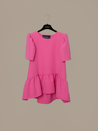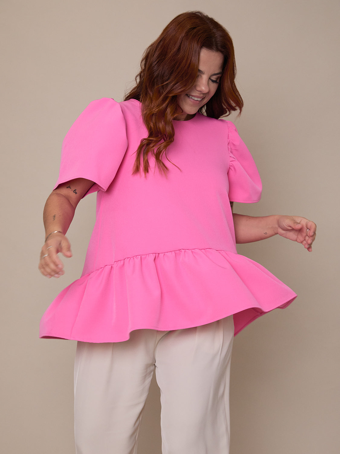 Blusa assimétrica com folho drapeado e manga balão.
