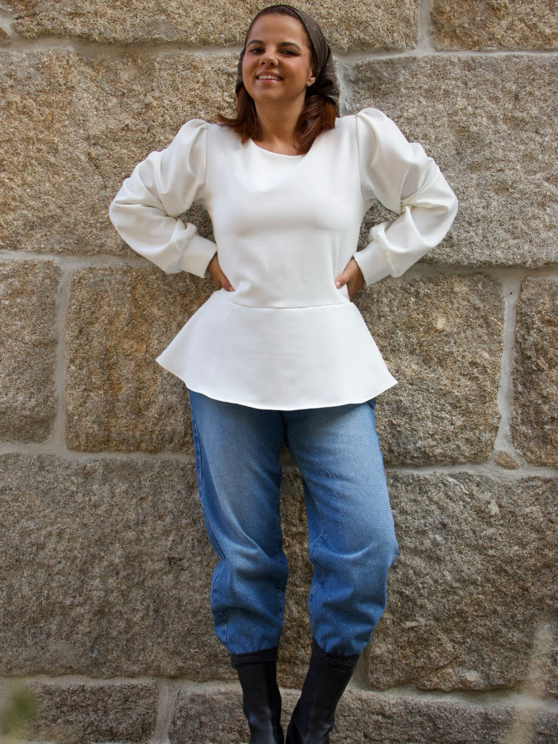 Blusa efeito peplum com manga abalonada, com pregas no ombro e punho na manga.