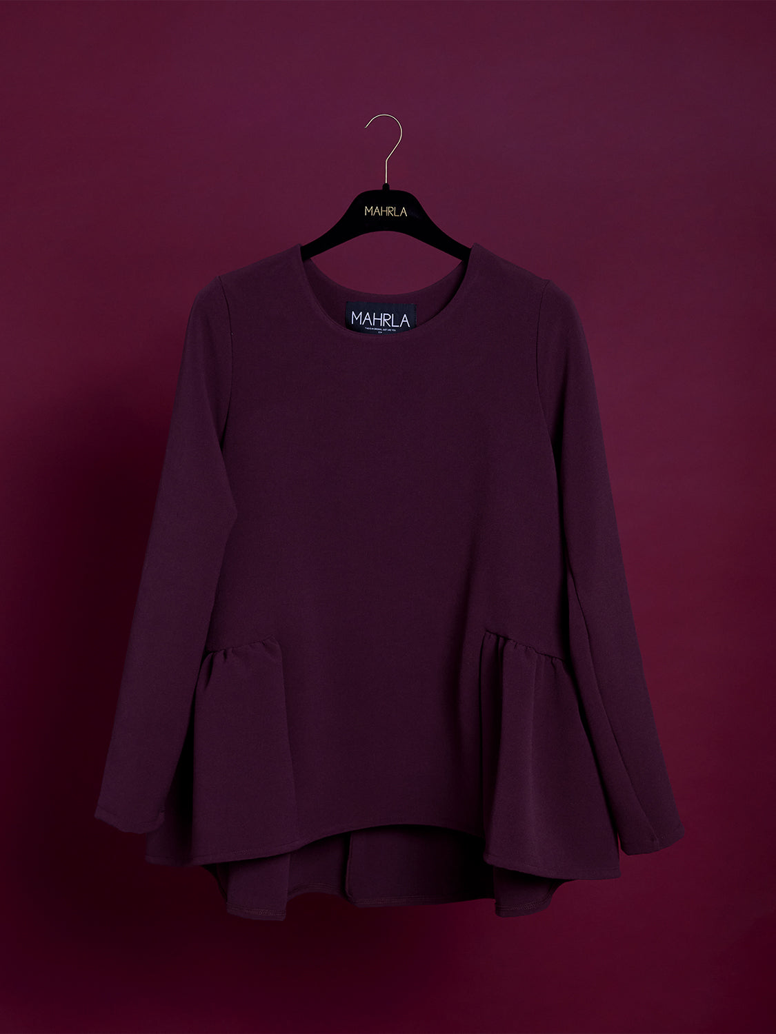 Corte assimétrico com folho a toda a volta excepto na parte mais frontal.