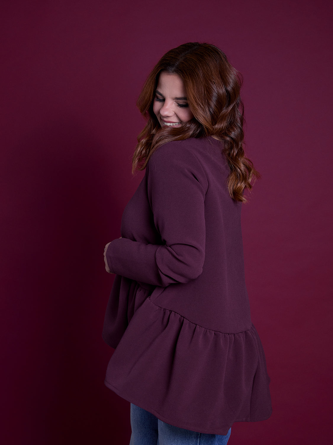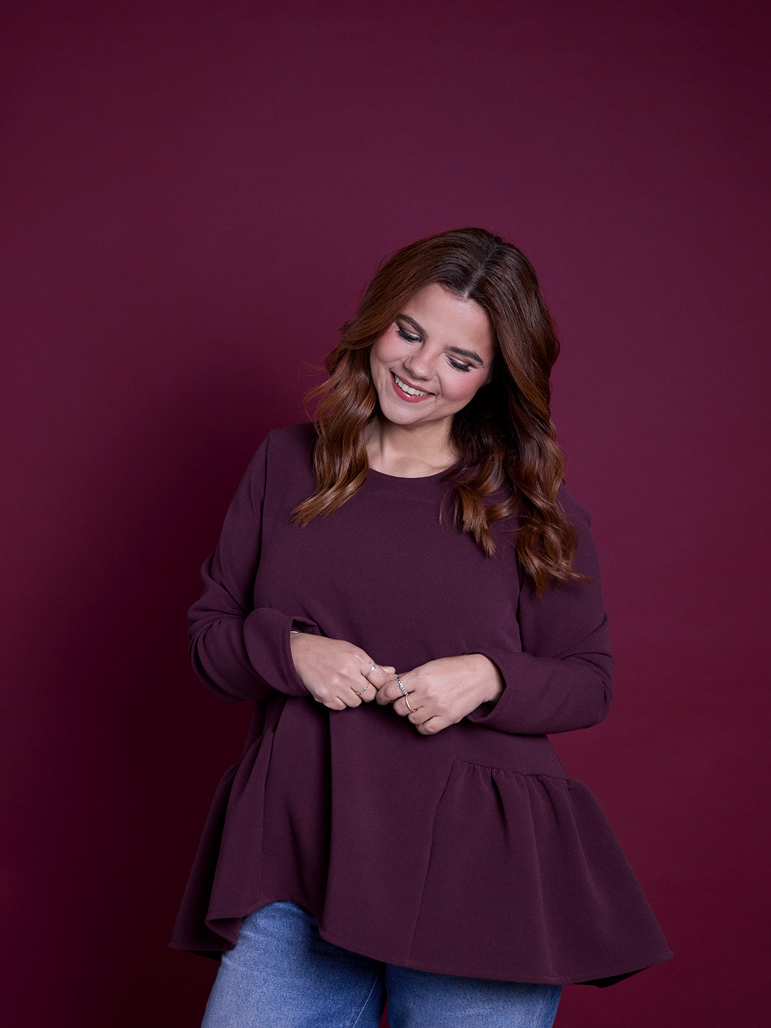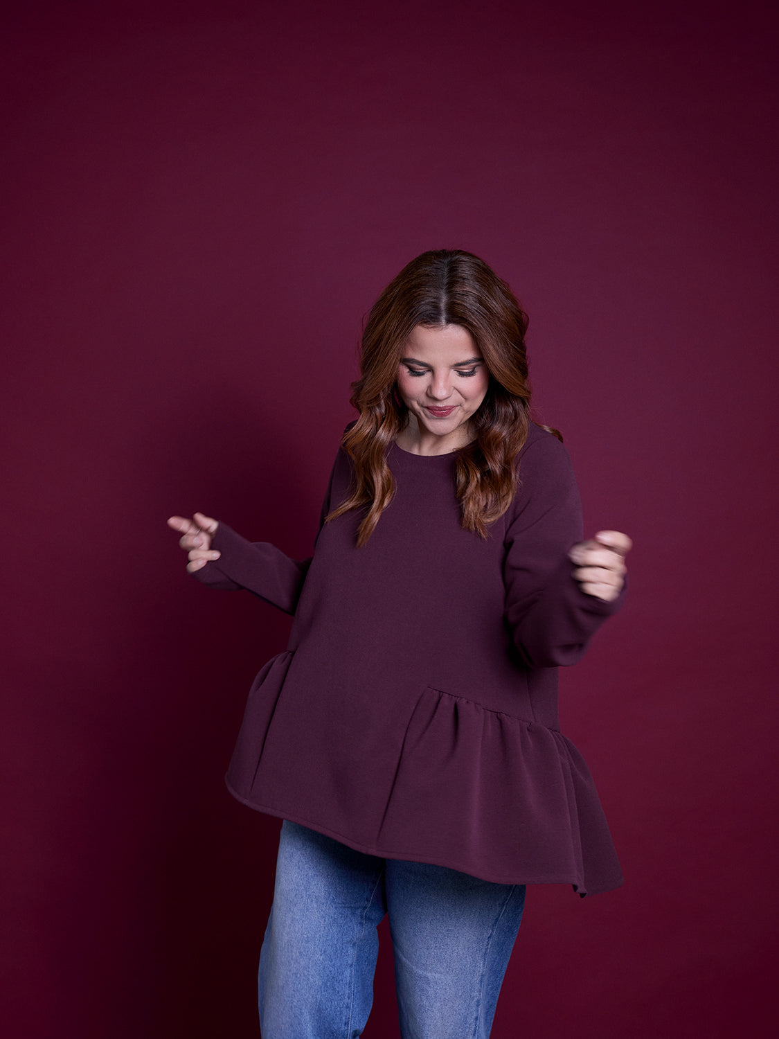 Blusa Cubic criada em 2017 e trazida pela primeira vez de novo neste Natal num vermelho delicioso.