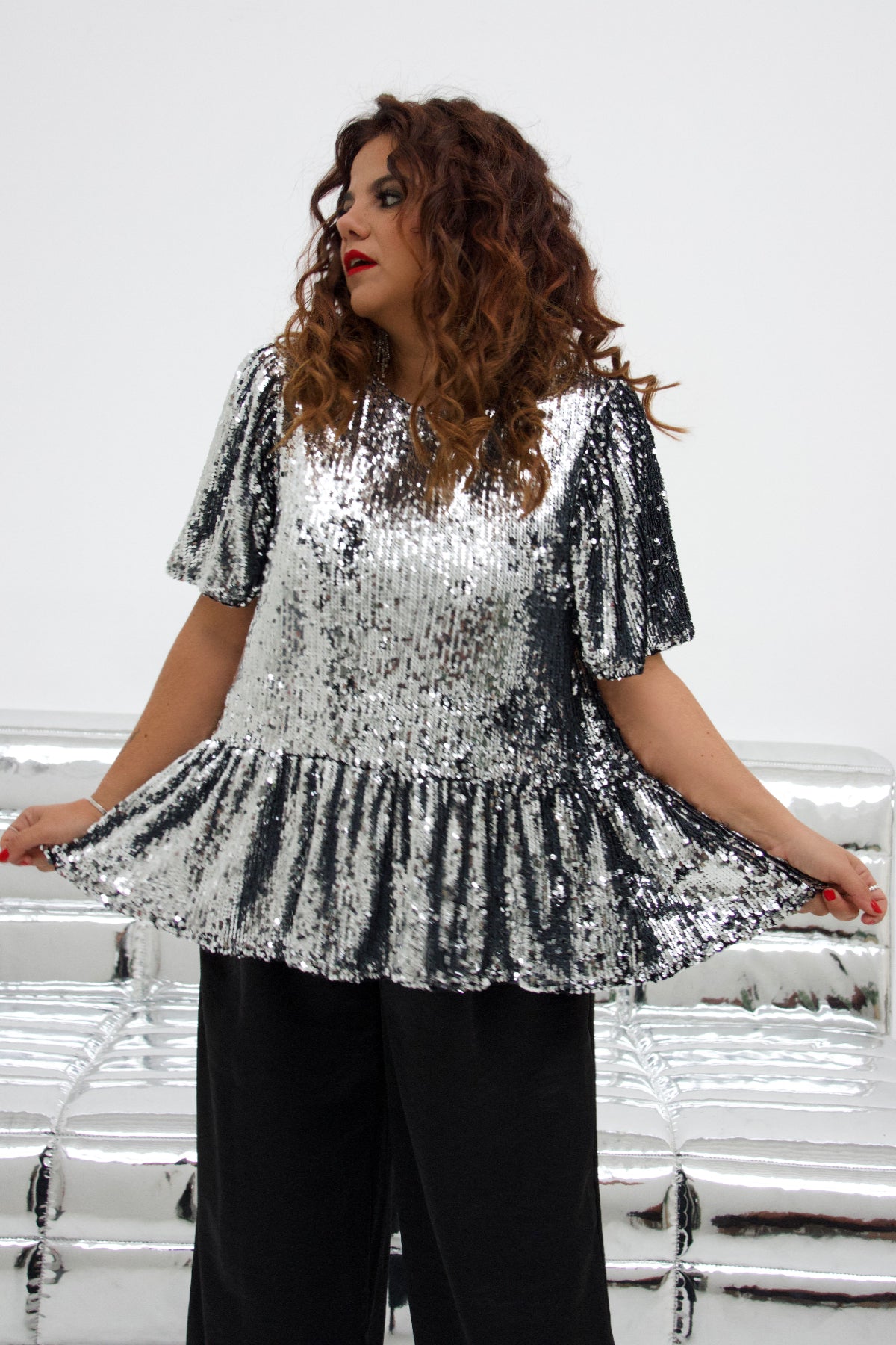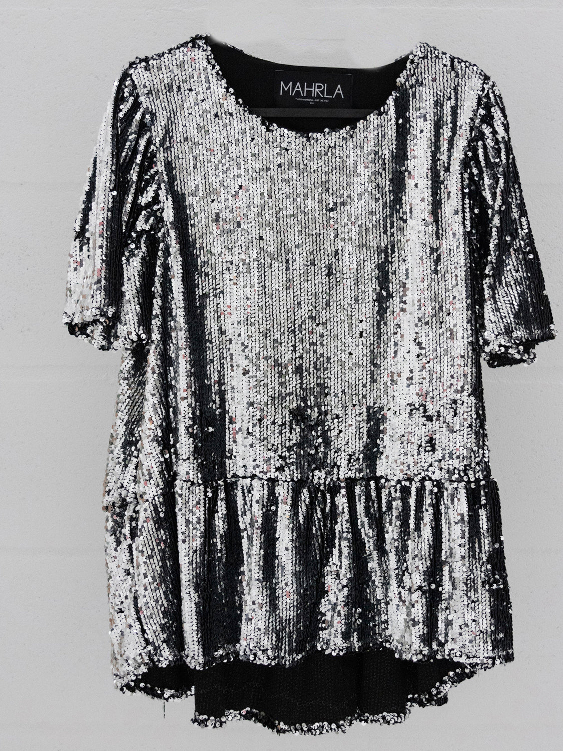 Lantejoulas prateadas, forrada até à zona do folho inferior. Sílvia mede 1,58 e usa o S/M. Para especificação de alguma medida em concreto enviar email para info@mahrla.pt Não foi possível carregar a disponibilidade de recolha 97% polyester + 3% elastano