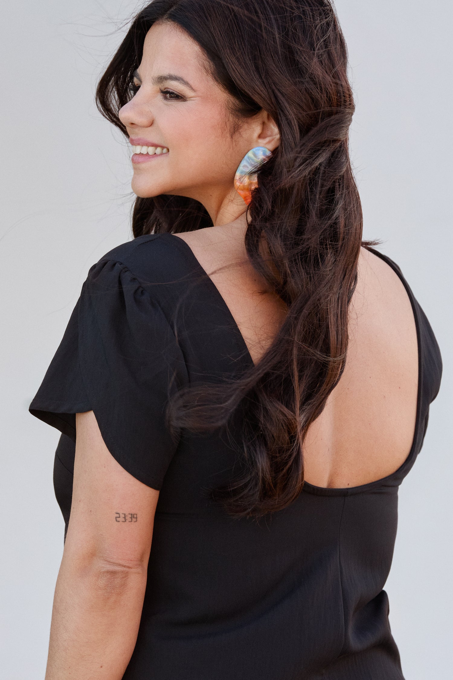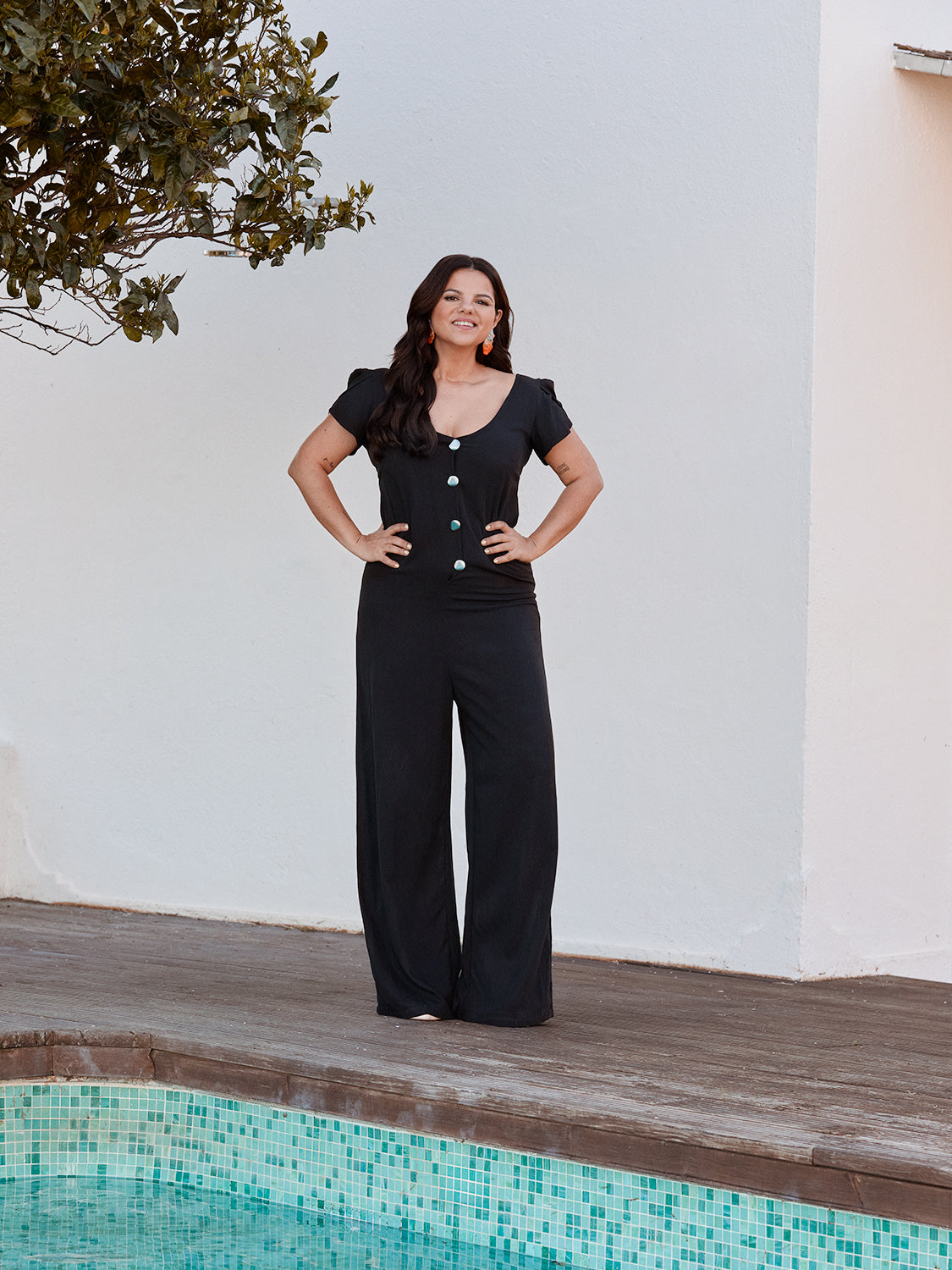 Decote redondo e abertura na frente com botões prateados que abrem.