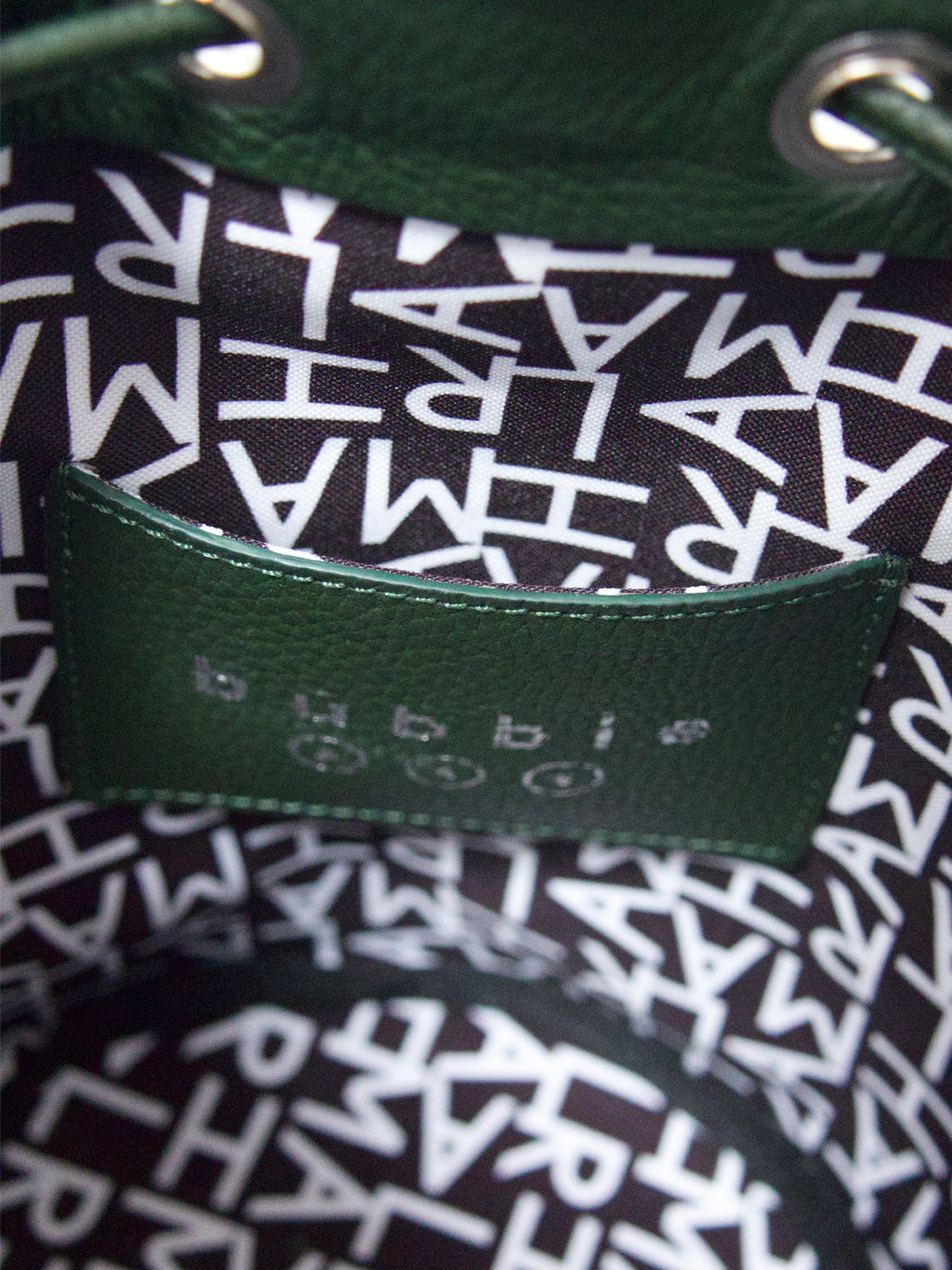Forro interior preto com padrão personalizado MAHRLA e bolso interior minimal, gravado com logo de identificação BUBBLE BAG. Acabamentos de metal prateado.