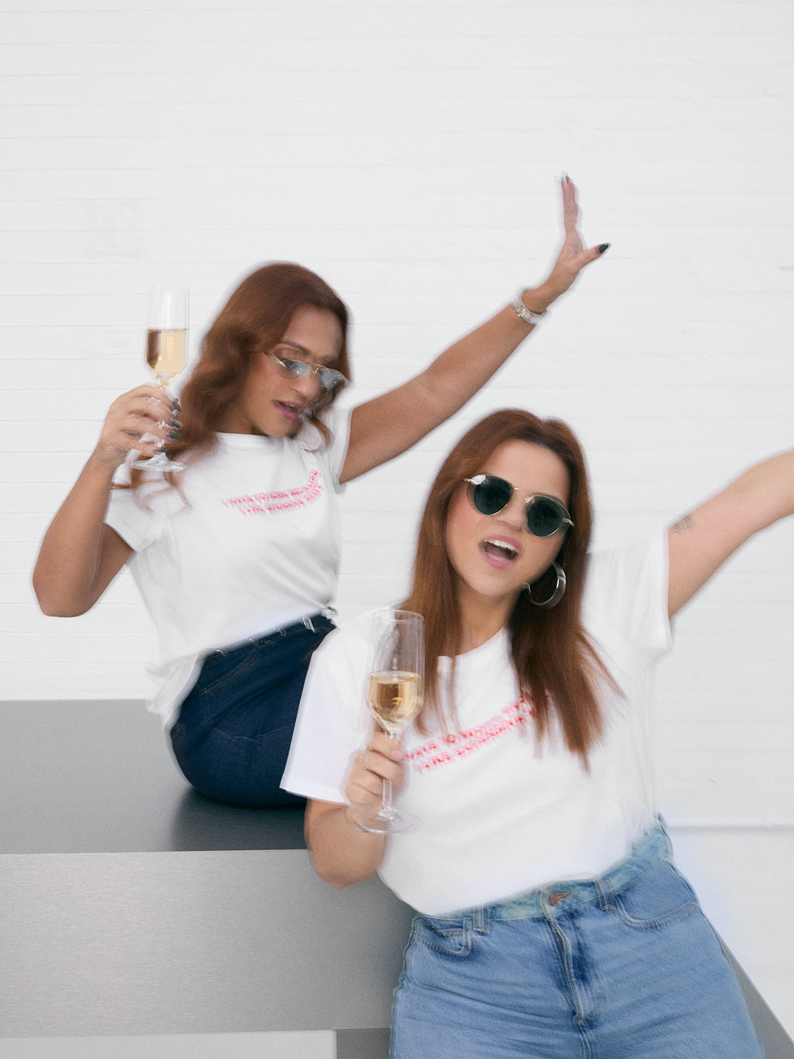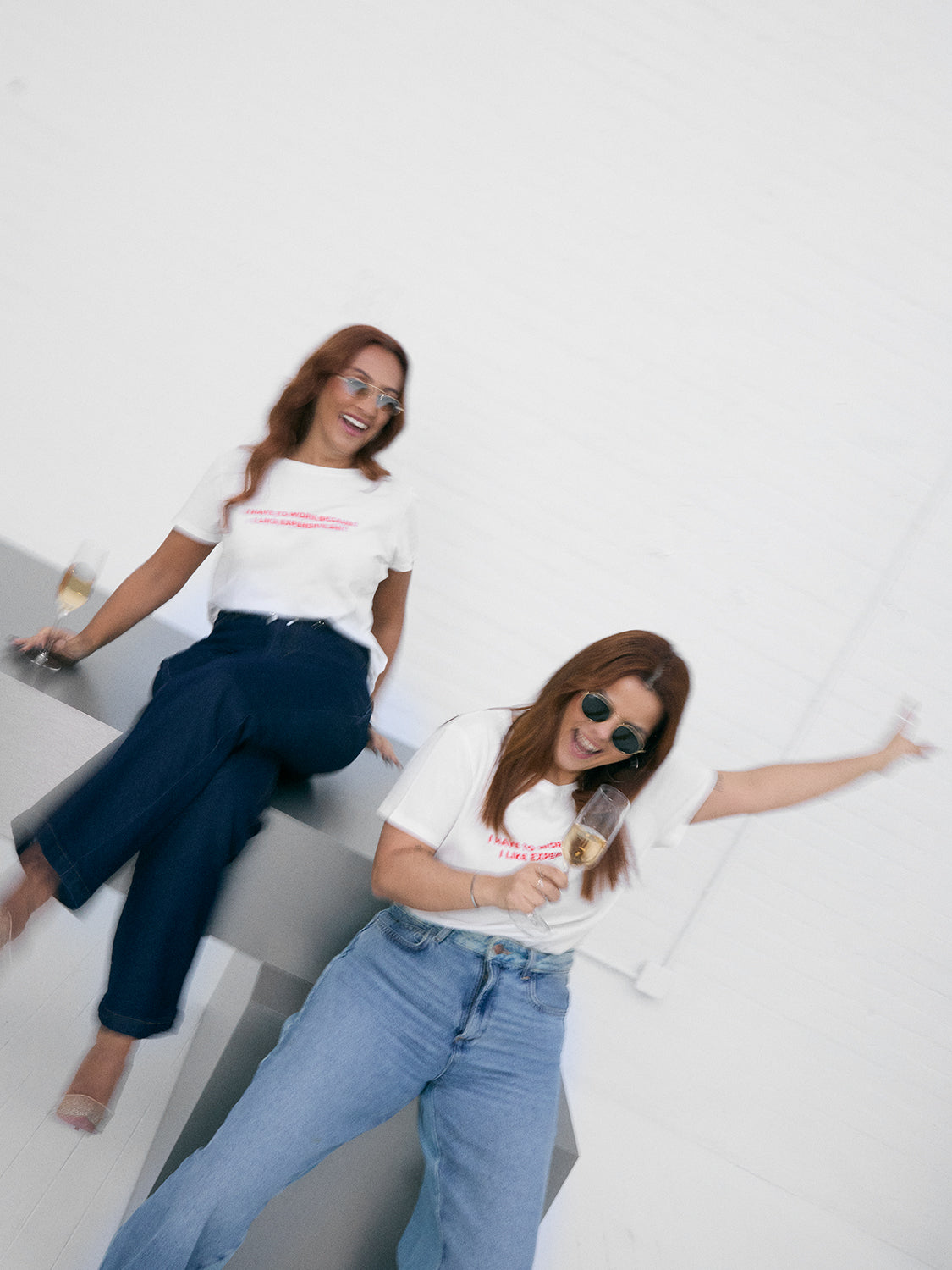 Susana veste t-shirt tamanho XS/S e Sílvia o S/M nas fotos.