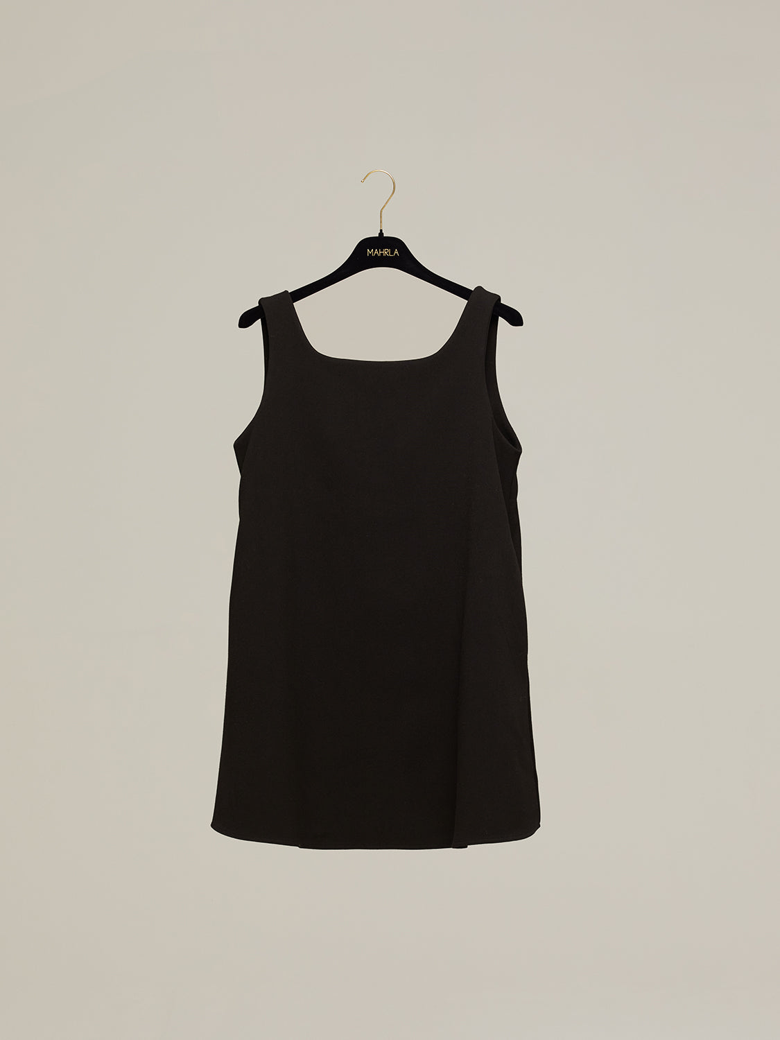 Vestido curto, básico, com decote na frente e nas costas.