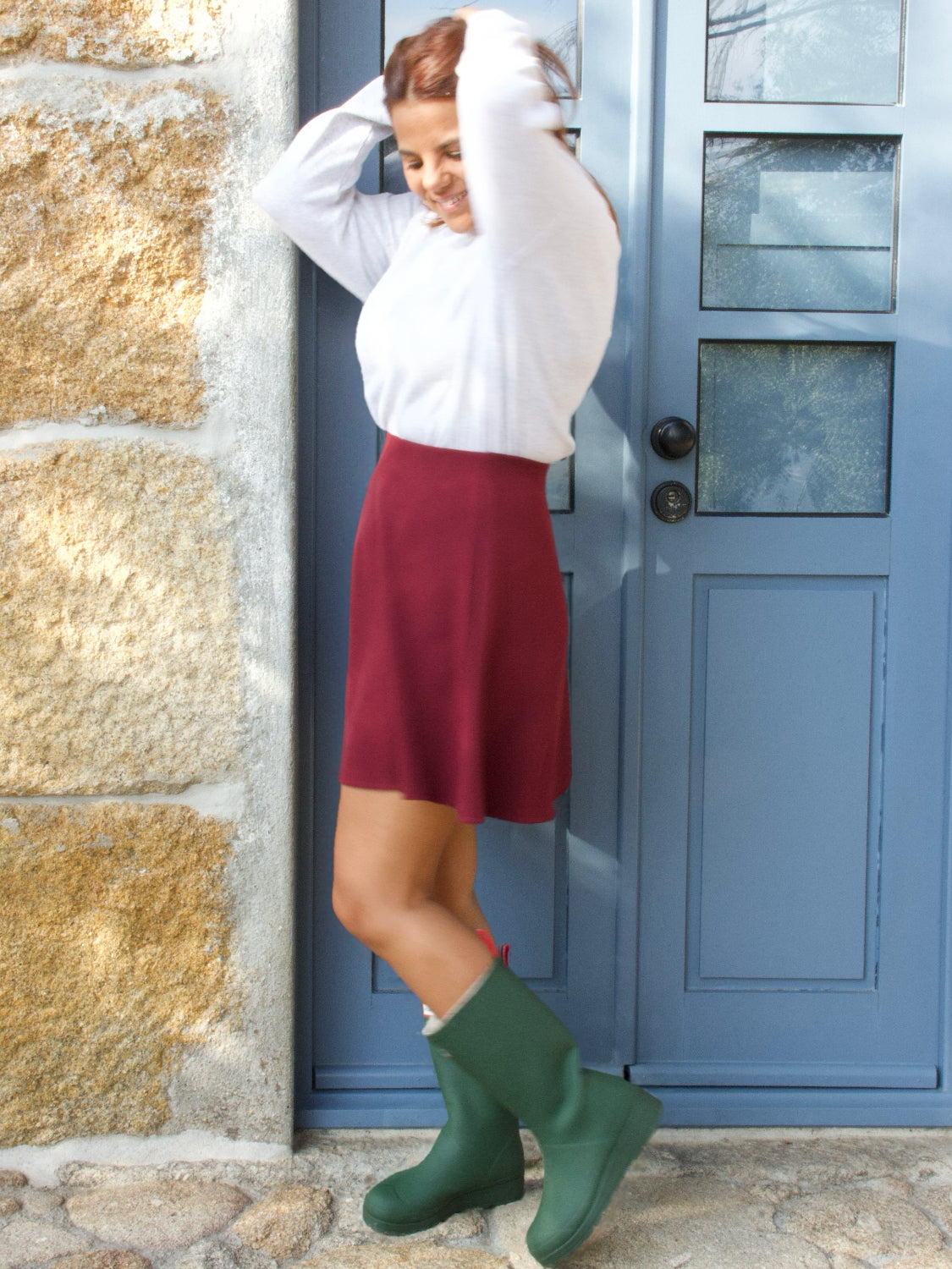 Por ser um tecido com pouca elasticidade aconselhamos a que vista a saia por cima de forma a ela entrar sem dificuldade.